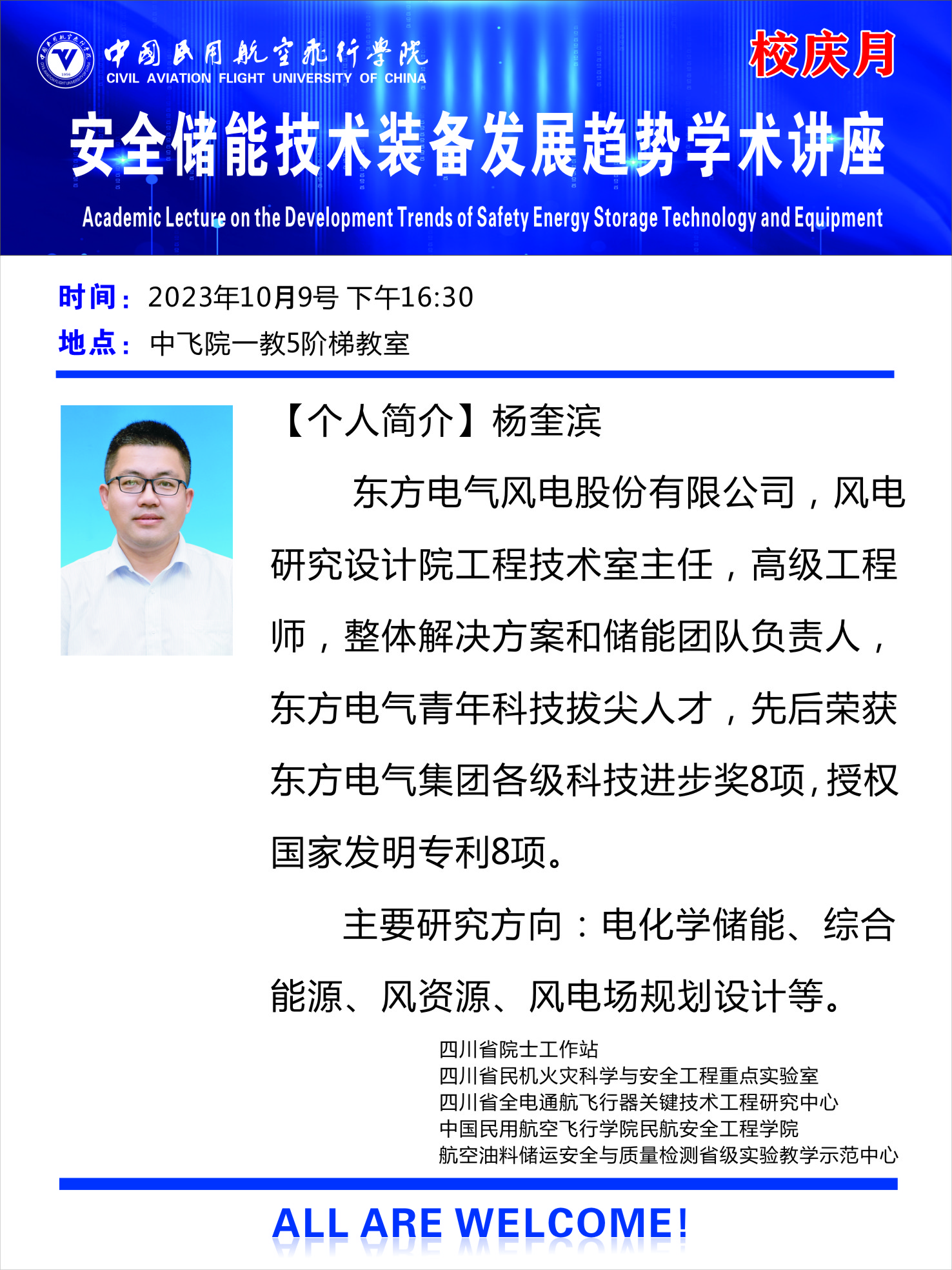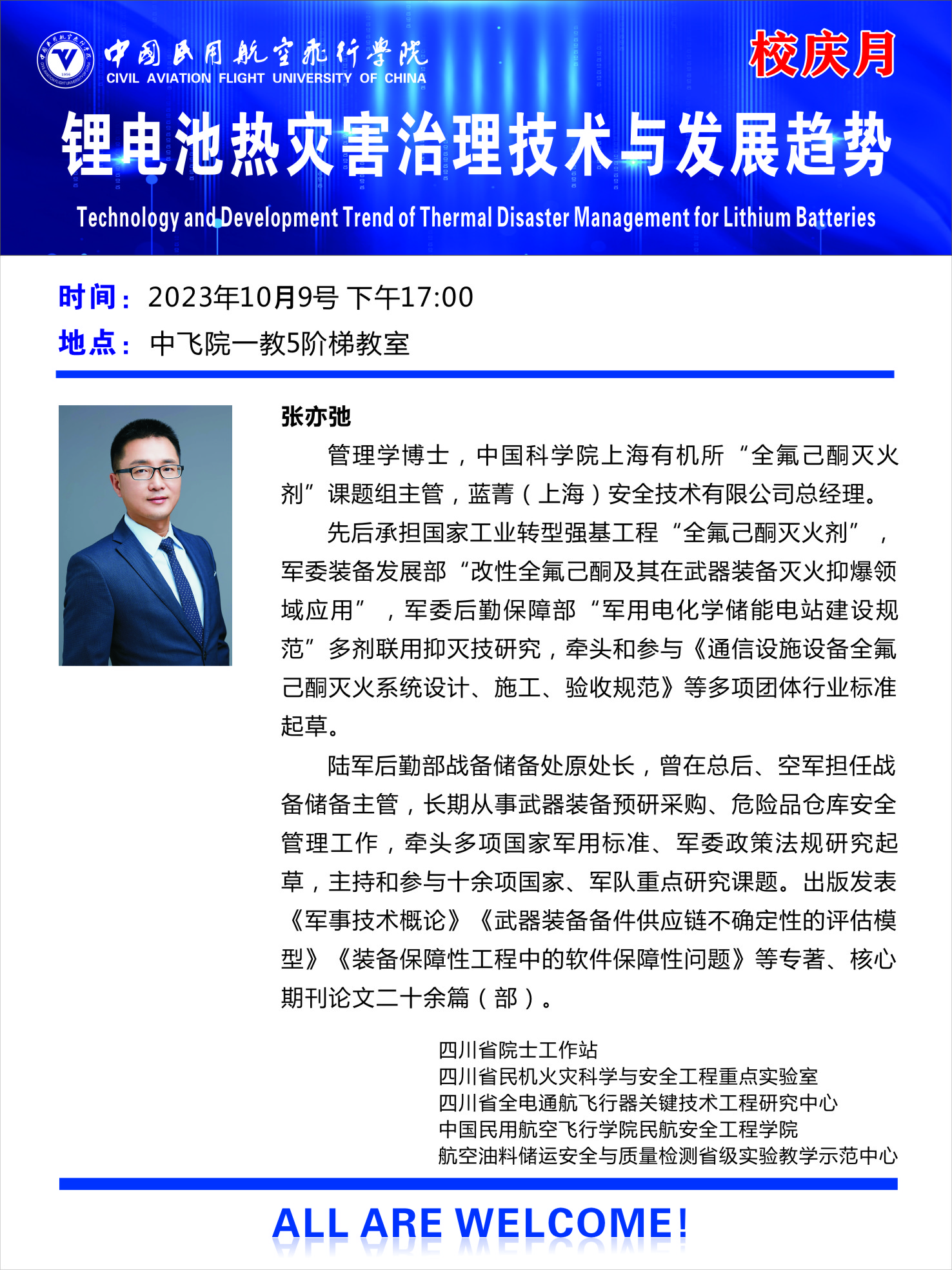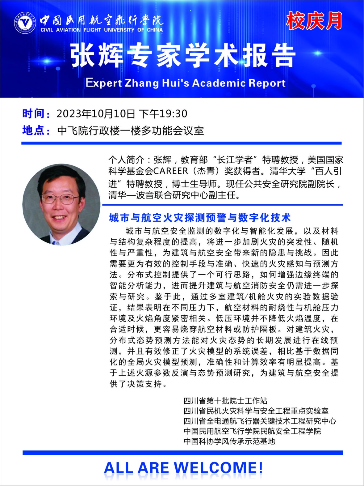 2023年10月9日、10日,为营造良好的科研和学术氛围,庆祝中飞院建院67周年,扩大公司在行业内的科研影响力、提高公司师生的科研素养,安工院特邀请教育部“长江学者”、清华大学“百人引进”特聘教授张辉、蓝菁(上海)安全技术有限公司总经理张亦弛、东方电气风电股份有限公司高级工程师杨奎滨,来公司开展专家主题学术讲座。三亿经理贺元骅、副经理何强、教师代表、全体研究生和本科生代表参加了讲座。本次讲座由三亿、民机火灾科学与安全工程四川省重点实验室、四川省第十批院士工作站、中国科协学风传承示范基地、四川省全电通航飞行器关键技术工程研究中心等单位共同承办。